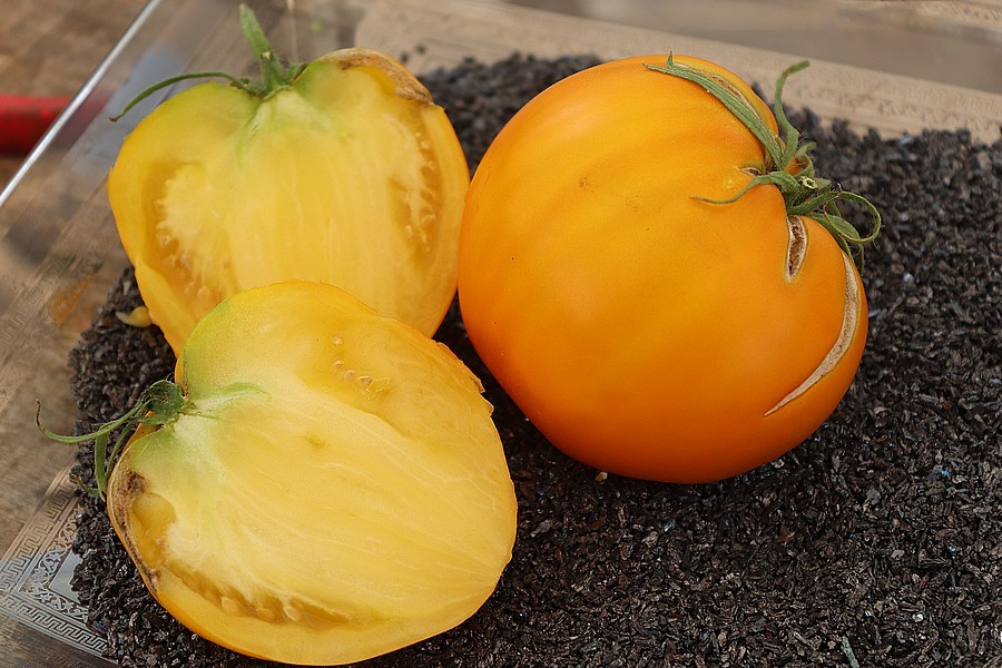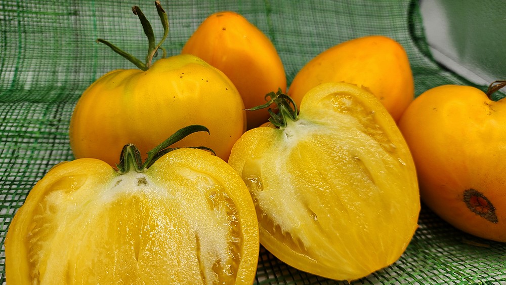 Fruit jaune cordiforme de 200 à 400 grammes. Variété originaire de Russie. Très productive, beaucoup de chaire savoureuse et ferme.
